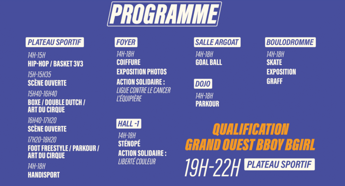 Pour clôturer le festival, une battle de breakdance – en présence d’un jury professionnel – fera office de clou du spectacle de 19h à 21h. L’événement réunira des danseurs du Grand Ouest selon plusieurs catégories (Adulte féminin / masculin et moins de 16 ans) qui tenteront de se qualifier pour le championnat de France bboy / bgirl. « On porte la finale régionale du circuit et les vainqueurs accéderont à la finale nationale », précise le chargé de communication.