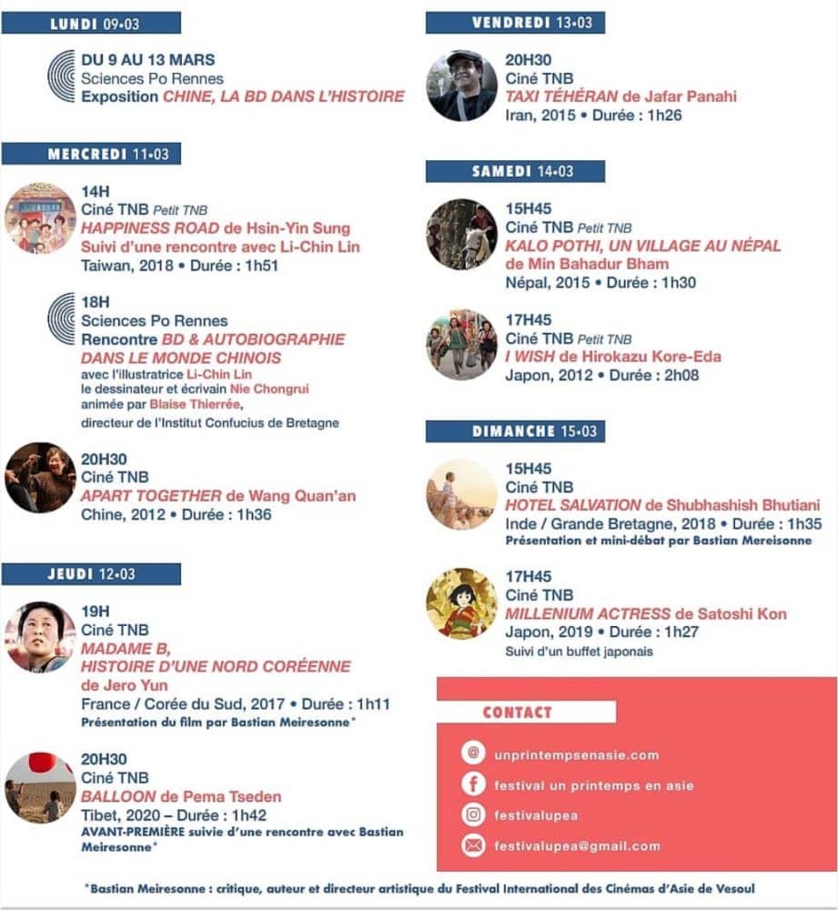 Diversité : « En plus des neuf projections proposées au cinéma TNB du 11 au 15 mars 2020, une exposition intitulée Chine, la BD dans l’histoire se tient jusqu’au 13 mars 2020 à Sciences Po Rennes. Une conférence sur : BD & Autobiographie dans le monde chinois, en présence de l’illustratrice Li-Chin Lin et du dessinateur et écrivain Nie Chongrui se tiendra également à Sciences Po le mercredi 11 mars 2020 à 18h. Si la Chine est particulièrement mise à l’honneur à travers ces deux temps forts, c’est parce que nous travaillons en partenariat avec l’Institut Confucius de Bretagne. Mais la Chine n’est pas le seul pays à être sondé et analysé; nous proposons des présentations et des mini-débats sur un film indien, un film tibétain et un film coréen. À l’issue de la projection du dernier film qui est un film japonais, un buffet à l’effigie du Japon sera également servi. »