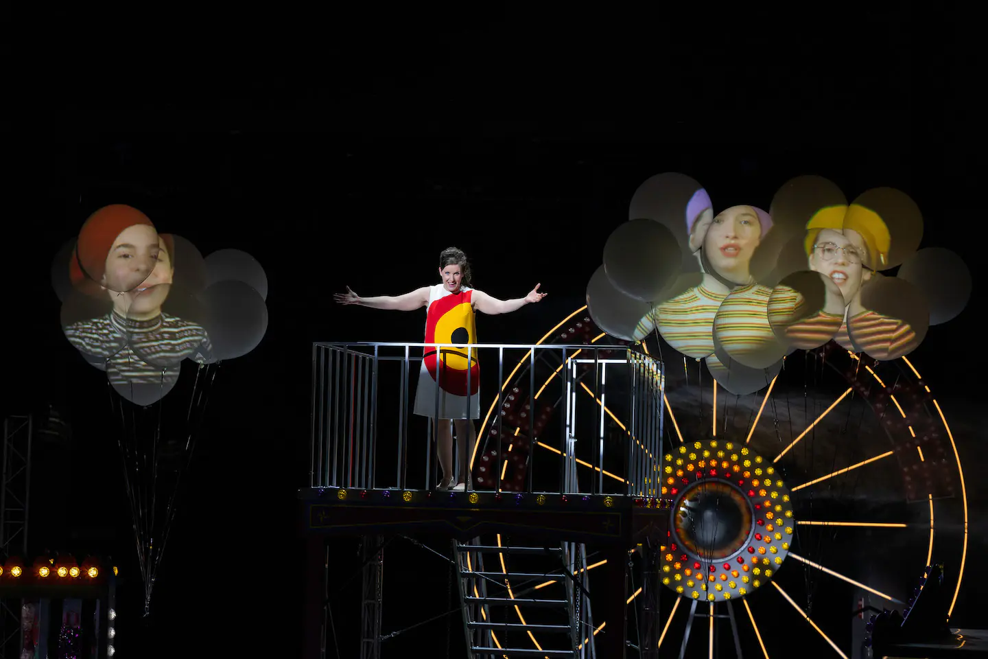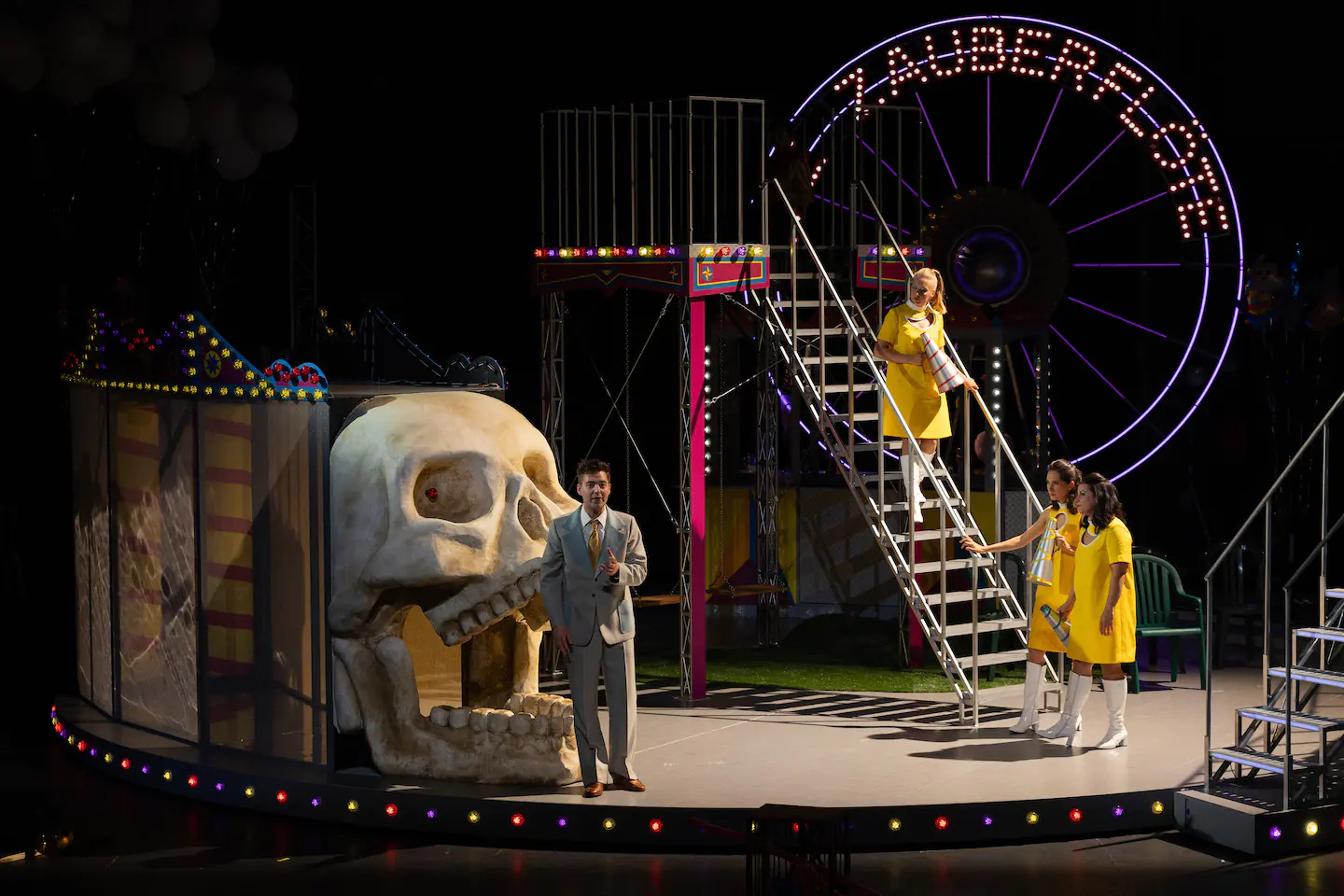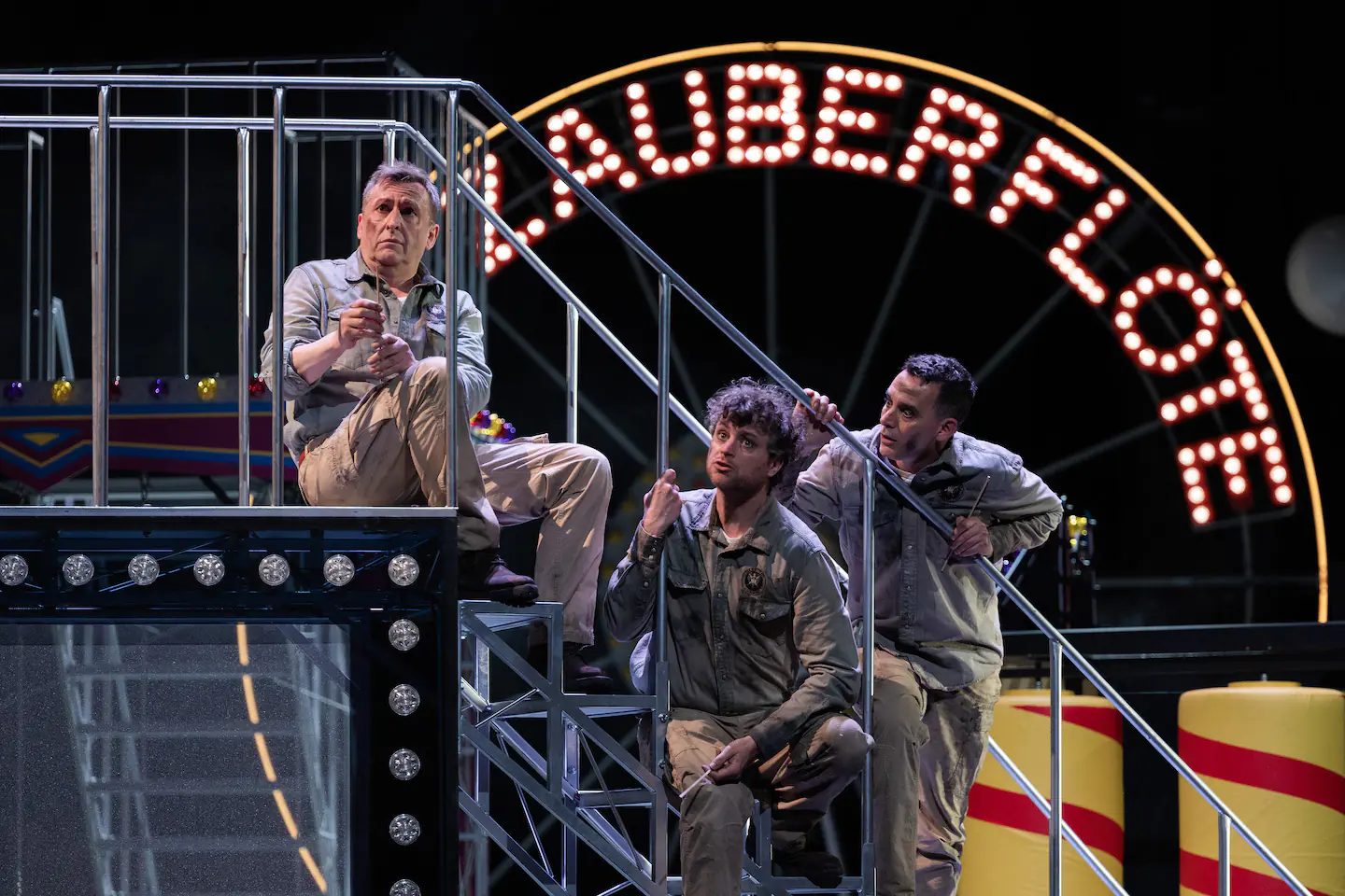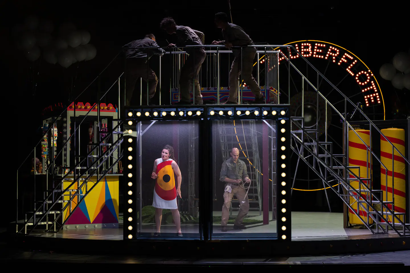 Dans le film de Miloš Forman, Amadeus, l’auteur nous décrit le musicien comme un véritable punk de son époque ; c’est un peu l’image que propose la mise en scène survitaminée de Mathieu Bauer. Sa transposition dans un monde qui oscille entre des ambiances foraines et parfois circassiennes ne nuit en rien à l’argument et renforce même cette idée de transgression et d’exigence d’une liberté non négociable. Le plateau tournant occupant une grande partie de la scène offre d’infinies possibilités de changements d’ambiance, et les galeries mobiles et autres escaliers métalliques nous font changer d’espace avec facilité. La seule note légèrement discordante est liée à la permanence de mouvements sur le plateau : des entrées, des sorties, des mises en place, auxquelles, en tant que public, nous n’avons pas à assister, et qui nuisent à la concentration. La mise en scène déjà foisonnante s’en trouve alourdie, et cela trouble la lecture que nous faisons de l’œuvre.