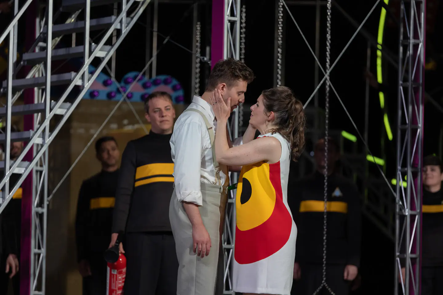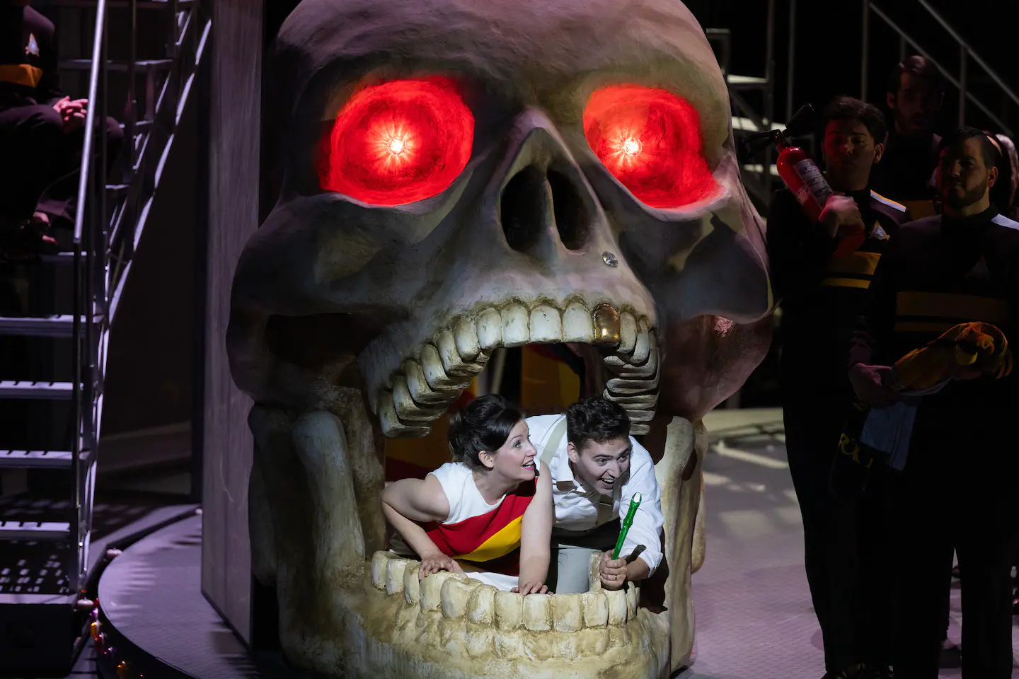 Maximilian Mayer, en Tamino, ne s’économise pas. Sa voix, un peu nasale dans les toutes premières notes, prend rapidement son envol et propose un Tamino très impliqué qui séduit l’assistance. Face à lui, Elsa Benoit, en Pamina, n’est pas en reste, et la grande qualité de sa technique vocale ne suffit pas toujours à combler un léger déficit en émotion. Cette aimable réserve, nous ne l’aurons pas pour Amandine Ammirati et Damien Pass, respectivement Papagena et Papageno. Tous deux, parfaitement dans le ton, campent deux personnages simples et truculents qui se recherchent avec frénésie et que l’on ne peut s’empêcher d’aimer. Le salut du public leur rendra un hommage bien mérité.