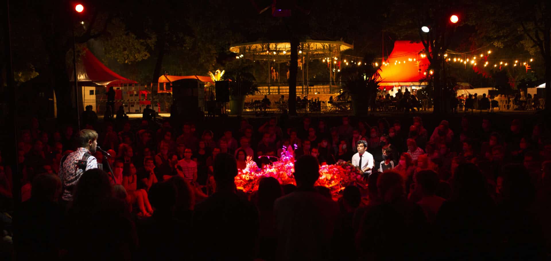 Installé en cercle, entre agora et cercle rituels, le public assiste dans une ambiance intimiste à la convocation de la thématique de la mort (et de fantômes) par trois comédiens et musiciens talentueux, Jérôme Colloud, Renaud Vincent, Cédric Cambon. « On a choisi de ne pas mettre de distanciation entre nous et le public », précise-t-il. « C’est un moment passé ensemble où l’on peut se regarder les uns et les autres, en ayant tous la même place sur un sujet qui nous concerne tous. »