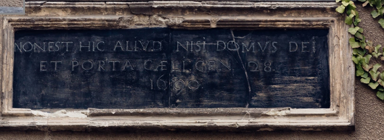 Sur le pignon sud, une inscription tracée dans une plaque de calcaire a été insérée dans la maçonnerie : « Non est hic aliud nisi domus Dei et porta coeli. Gen. 28. 1690 » (« Ce n’est ici rien d’autre que la maison de Dieu et la porte du ciel, Génèse 28, 1690 »). La date, cohérente au vu des sources et des datations dendrochronologiques, atteste de la fin des travaux de transformation du jeu de paume en chapelle en 1690. (INRAP)