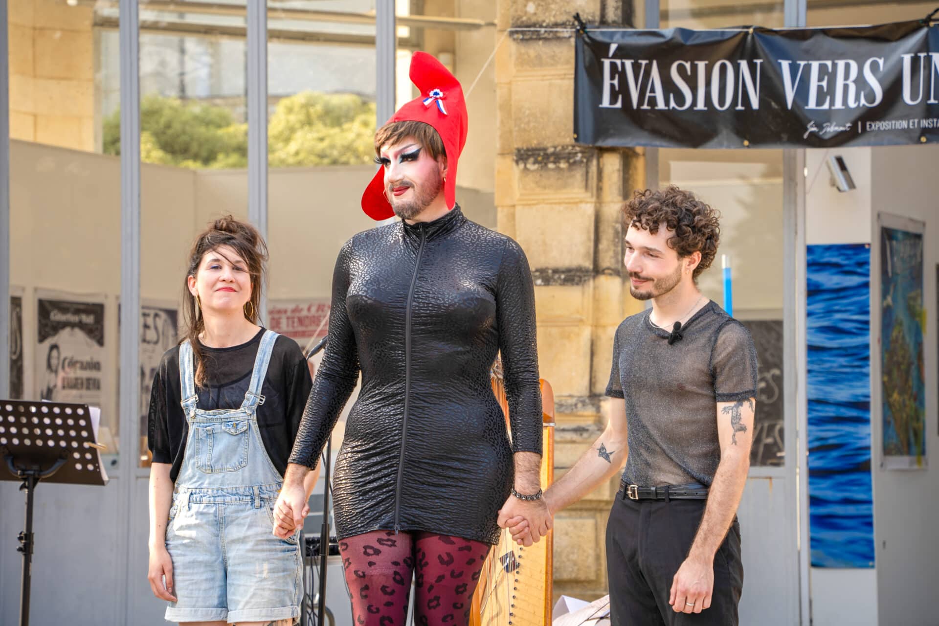 Tous ces contrastes créent un nouveau monde, mais aussi une réflexion sur notre propre réalité. La performance du 14 juillet et la gravure qui en résulte, « Et si Marianne était vilaine ? », mettent par exemple en scène une Marianne queer, interprétée par la Drag Queen Anne-Marie Kondom accompagnée par la harpiste Jeanne Toutous, dans un paysage sonore composé par Dante Mendel. Dans l’exposition Évasion vers un futur oublié, l’affiche de l’événement se confrontait à des archives de la Seconde Guerre mondiale et de la France de Vichy. Avec la performance, Jimeno voulait installer la narration de l’exposition en voyageant dans le temps : « La performance questionne ce qu’il reste de la République et ce qui en a été fait dans l’Histoire. Elle invite à réfléchir à comment se la réapproprier en jouant avec ses symboles. »