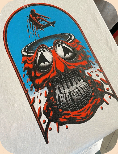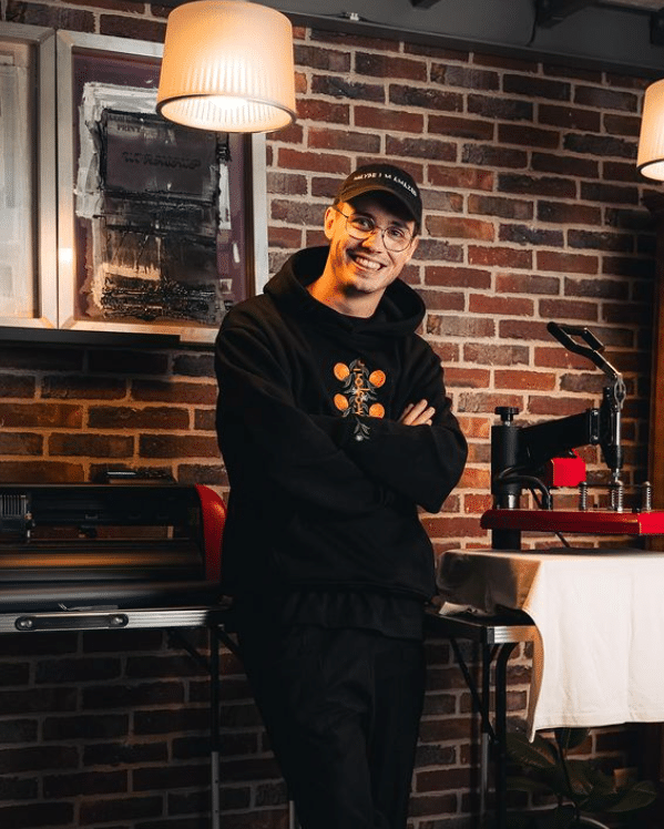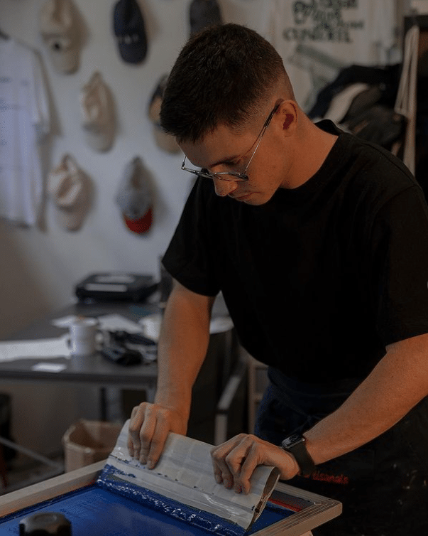 Parmi les imprimeurs textiles de Rennes on trouve Lartisanais, fusion d’ « artisan » et « rennais ». A la tête de cet atelier, Thomas Meyer (alias Reyem), pour qui l’aventure a commencé au lycée : « J’ai suivi le parcours standard en filière SES et, en parallèle, j’imprimais des t-shirts dans ma cave avec une petite presse de sérigraphie. C’est comme ça que j’ai lancé ma marque de vêtements Banur ». Après sa marque, c’est son atelier Lartisanais qui voit le jour, aujourd’hui situé route de Lorient. C’est dans ce local spacieux de 165m2 que l’imprimeur a élargi son champ d’action : après la sérigraphie, les techniques de flocage, de broderie et depuis peu de DTF (Direct To Film). Pour l’instant, Thomas met Banur sur pause : « Je vis Lartisanais à fond parce qu’il y a toujours plein de projet en cours, même si Banur reste dans le coin de ma tête ».