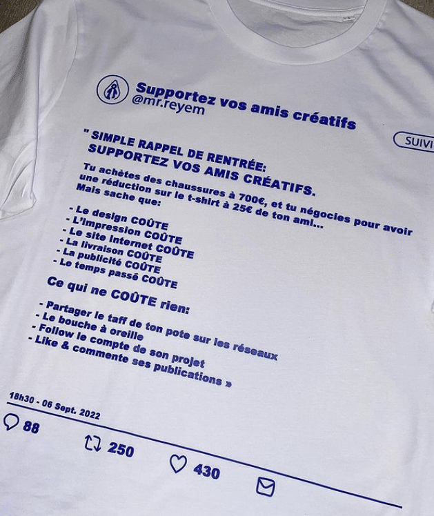 Pour les tissus, l’atelier préfère utiliser ses propres produits pour diriger le client en fonction du graphisme souhaité, du volume et de la quantité de vêtements. « Nous avons beaucoup de personnes qui viennent avec leurs vêtements, parfois de mauvaise qualité, et l’impression risque alors de s’effacer en machine ou carrément de ne pas adhérer, explique Reyem, nous avons donc nos propres stocks de t-shirts en coton dont certains bios ». Pour ce qui est du prix d’un t-shirt, Lartisanais fait au cas par cas. Il y a bien sûr le choix du tissu mais aussi sa provenance. « Nous nous fournissons à plusieurs endroits pour répondre à différents budgets, car tous nos clients n’ont pas les mêmes moyens pour acheter du made in France ou Portugal par exemple, et surtout s’ils souhaitent imprimer plusieurs exemplaires. » Le flocage et le DTF suffisent pour deux ou trois pièces en comparaison avec la sérigraphie qui s’utilise à partir d’une trentaine. Le prix s’ajuste par la suite en fonction du nombre de couleurs et de la taille du logo.