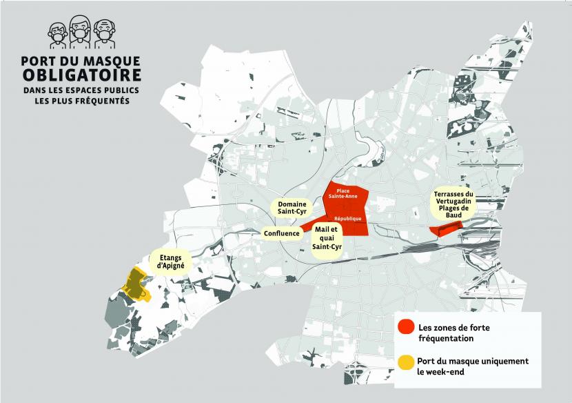 - En concertation étroite avec les maires des communes concernées (Rennes, Saint-Malo, Cancale, Vitré), le port du masque sera rendu obligatoire, sur la voie publique, pour les personnes de onze ans et plus dans les lieux identifiés comme faisant l’objet d’une concentration importante de personnes à compter du samedi 8 août et jusqu’au 31 août inclus ;