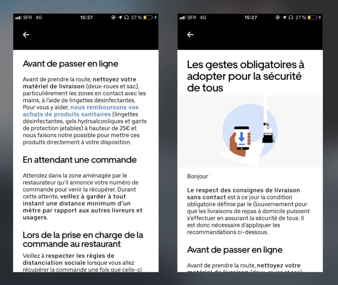 Comme des centaines d’autres, William a reçu une “formation”, c’est-à-dire une vidéo ou une liste de recommandations à appliquer en cette période de Covid19. « On peut difficilement appeler ça une formation … » soupire le jeune garçon. Seul Uber Eats annonce rembourser les frais de produits sanitaires à hauteur de 25 euros et Deliveroo instaure un système de téléconsultation médicale accessible à ses coursiers via le site Qare. Entres deux commandes, les livreurs attendent place de la Mairie, sur les marches de l’Opéra. Tous ne portent pas de masques. Certains se serrent la main aisément sans respecter la distance minimum préconisée. « Les mesures barrières, c’est selon la bonne conscience de chacun, au petit bonheur la chance ! » ajoute William, qui ne porte pas de masque non plus. Le soir, sa cagoule fait office de protection. Pendant la journée, il prend ses distances, consciencieusement.