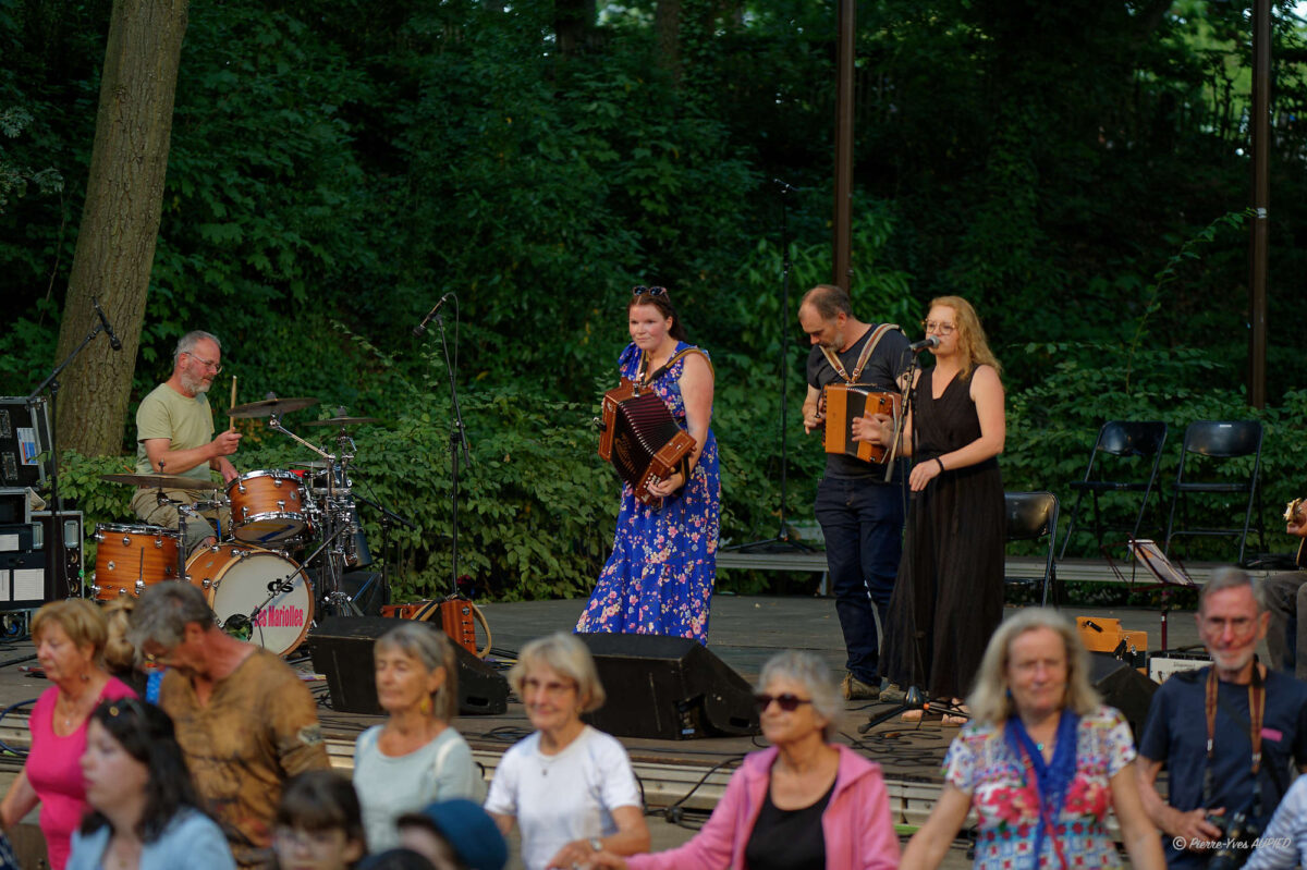 La soirée commença avec le groupe Les Mariolles : un groupe de la région de Fougères, musique trad’ de Haute-Bretagne, un groupe très dynamique et festif qui n’a pas pu retenir les nombreux spectateurs venus danser devant la scène du théâtre de verdure du parc du Thabor. Caroline Boquain et Nicolas Mahé (accordéon diatonique), Anne-Sophe Maupilé (bombarde), Léa Féliot (chant gallo et français), Sébastien Sollier (guitare), Christophe Collin (batterie).