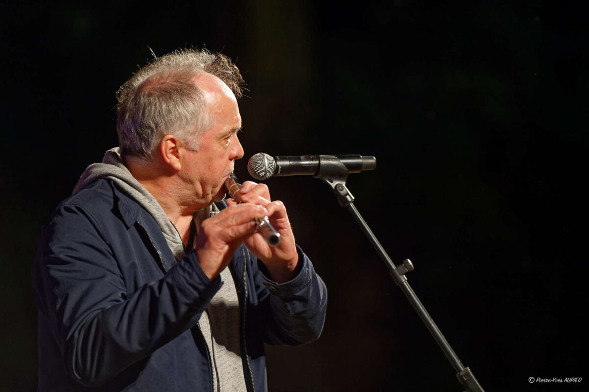 Jean-Michel Veillon à la flûte traversière en bois. Son style parfaitement identifiable est aujourd’hui reconnu en Bretagne autant qu’en Irlande. Les spectateurs de cette soirée des Mercredis du Thabor n’ont pas résisté à l’appel de la musique pour venir danser devant la scène.