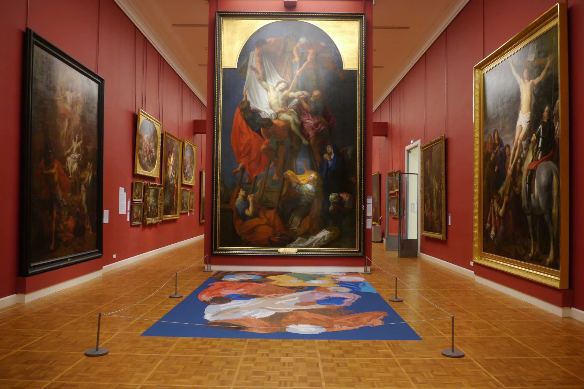 De même, La descente de croix (vers 1679), retable charismatique de Charles Le Brun devient Amour et bagarre dans les souliers propres sur gazon sous le regard de Vincent-Michaël Vallet. Un écho à la querelle du coloris, débat qui secoue la peinture française à la fin du XVIIe siècle. D’un côté, les poussinistes prônent la suprématie du tracé dans la peinture et de l’autre, les rubenistes, Charles Le Brun en tête, privilégient l’importance de la couleur. « Je me suis posé la question de savoir à quoi ressemblerait le tableau s’il était posé au sol avant d’être relevé ». Jouant sur une symétrie inversée, le retable se transforme en composition contemporaine abstraite d’où émane l’essence des convictions de Charles Le Brun. À en juger par la palette de couleur qui s’étend sur le sol, Vincent-Michaël Vallet, et avec lui une partie de l’art contemporain, semble avoir choisi son camp, à l’encontre de la peinture académique du XVIIe siècle.