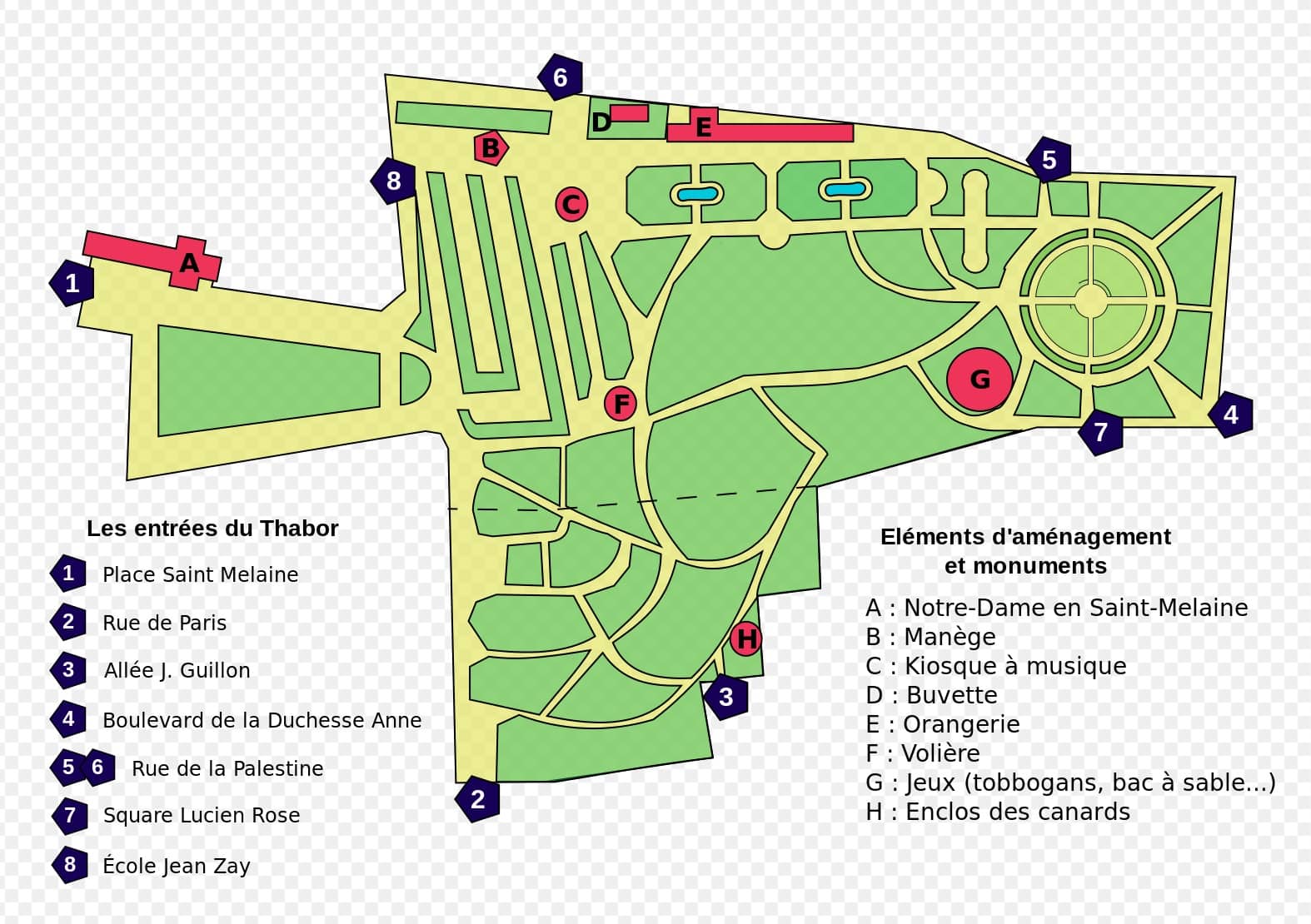Le parc du Thabor, poumon vert du centre-ville rennais, est un immense joyau de verdure et de sérénité, aujourd’hui accessible par six entrées ouvertes sur : la Place St-Melaine, l’Allée Jeanne Guillon, la Rue de Paris au sud, le Boulevard de la Duchesse Anne à l’est, la rue de la Palestine au nord et le Square Lucien Rose.