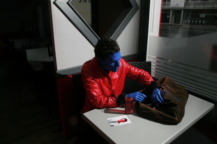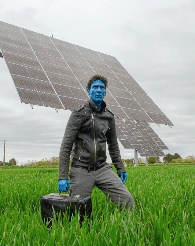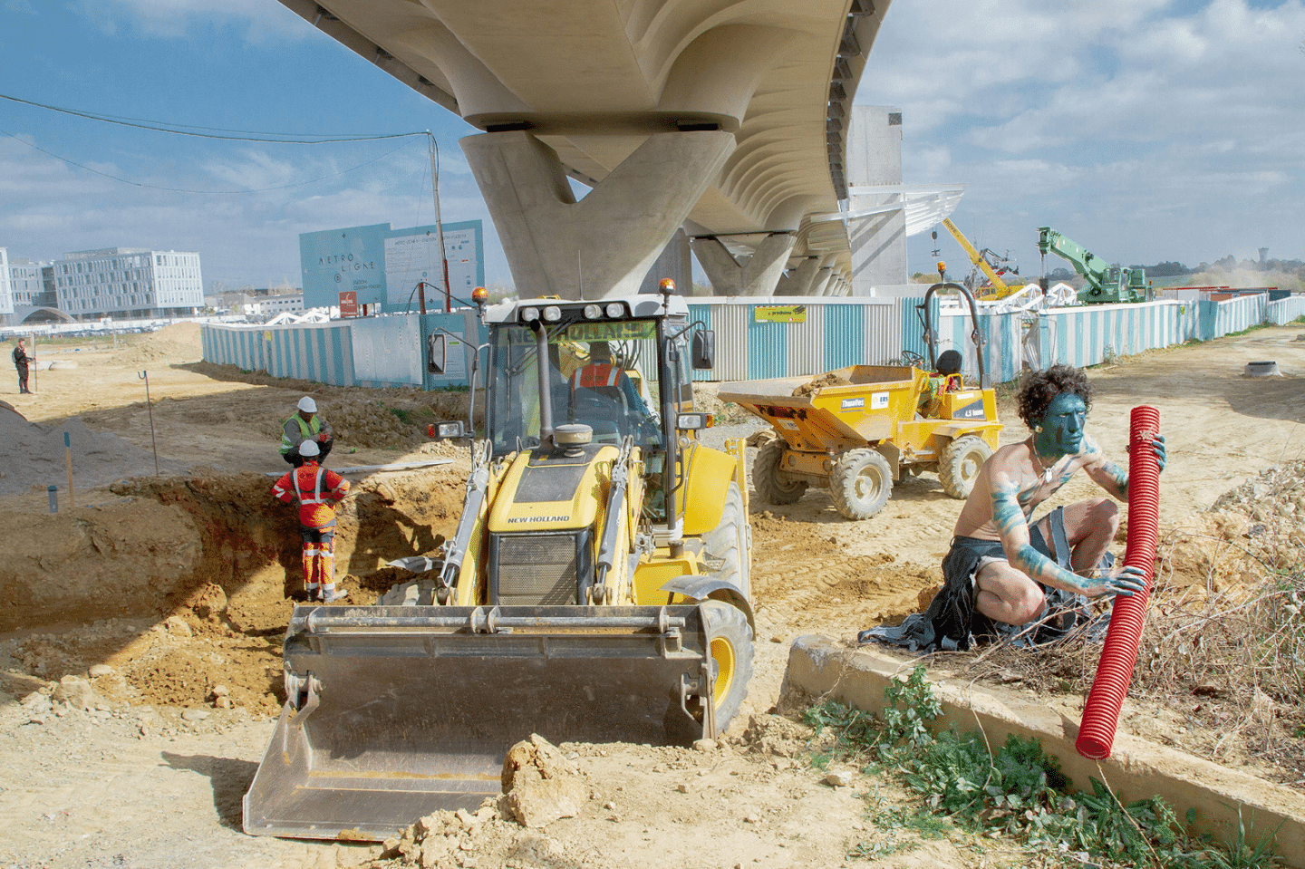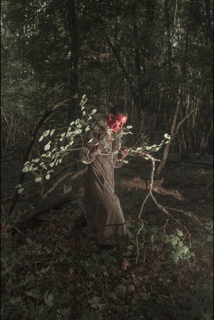 Entre photographie et performance, Jeremias Escudero se mue en une créature légendaire. Inspiré des traditions mexicaines, le personnage du Cerf Bleu semble étranger à l’image : peint en bleu, rouge ou noir, parfois masqué, c’est pourtant en utilisant ce qui l’entoure, de la végétation à des tuyaux de chantier, que ce personnage presque fantomatique repossède l’espace. Est-il perdu, cherche t-il les siens ou de quoi survivre dans cet environnement en perdition ? Cette série d’autoportraits questionne notre rapport à la nature, à la transformation et à ce qui nous est étranger. « Le Cerf Bleu emprunte les codes des Huichols, peuple indigène vivant dans la Sierra Madre et dont les terres sont aujourd’hui menacées d’exploitations minières » explique t-il. Ces indiens de la côte pacifique mexicaine sont connus pour leur artisanat minutieux qui retranscrit les visions que leur insuffle le peyotl, petit cactus hallucinogène. « Les Huichols donnent une grande importance à la mort, à la nature, aux esprits et à la transformation de manière générale ». En abordant ces thématiques, Jeremias Escudero invoque ces origines et cette entité bleutée fantasmagorique, dans un projet visant à documenter l’évolution de l’éco-quartier ViaSilva. Mais Le Cerf Bleu se promène aussi dans d’autres mondes, comme dans les paysages lunaires de la Côte de granit rose et les champs de panneaux solaires du Trégor, ou se perd dans l’effervescence de la ville.