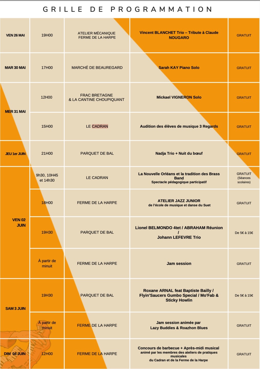 SOIRÉES PAYANTES (Vendredi 2 juin & Samedi 3 juin) Réservez vos billets sur jazzalaharpe.com onglet billetterie. Préventes à la Ferme de la Harpe et au Cadran (11 Av. André Mussat)