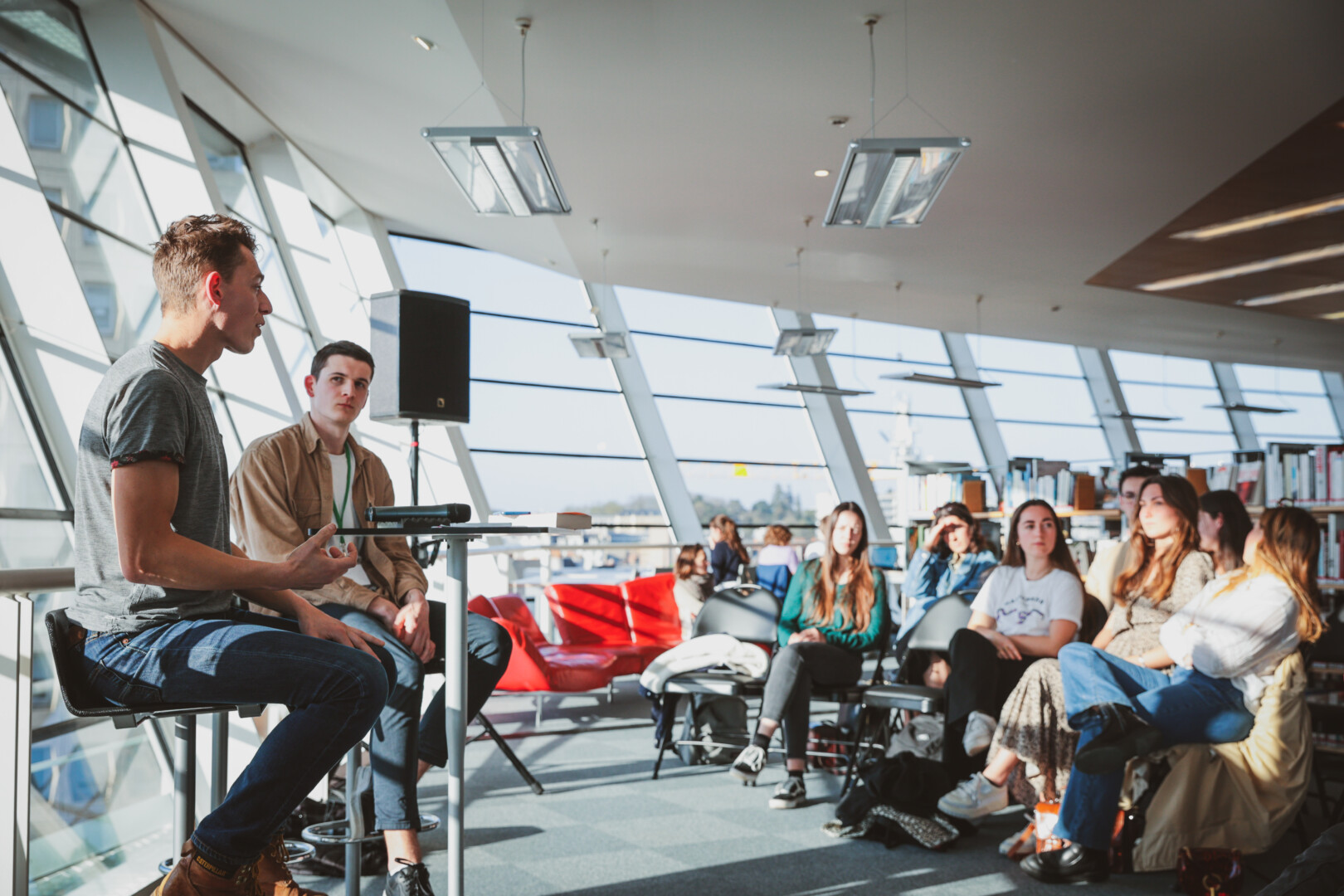 Dans ce dessein, ils ont choisi de nombreux invités comme Camille Etienne (militante écologiste française) ou encore Salomé Saqué (journaliste) qui ont animé des discussions ou des rencontres. On peut citer encore la présence d’Hugo Biolley, plus jeune maire de France, ou encore Matthieu Fleurance, membre du Collectif Travailler Moins. L’occasion pour tous de découvrir de nouvelles réflexions autour de Nos Futurs. Morgane et Juliette, deux étudiantes de Sciences Po investies sur le projet racontent :