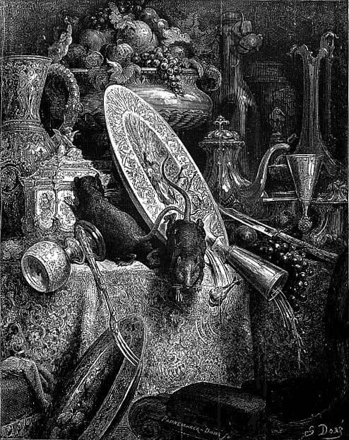 Que la crainte peut corrompre », Jean de la Fontaine, Le Rat de ville et le Rat des champs, 1668. Gravure par Gustave Doré, 1880.