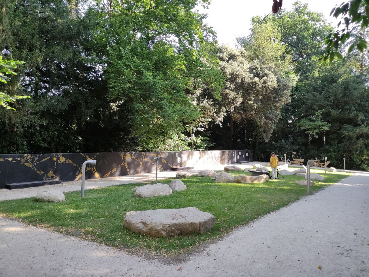 Le parc se divise en quatre zones. « La clairière », à gauche de l’entrée, devient un espace familial avec des jeux et du mobilier de détente. Des plateformes pour grimper, des tables de pique-nique et des bancs y sont installés. Cette première partie est aussi décorée de mosaïques en laiton, une œuvre du groupement Gilles Brusset et bOssa Talents, en partenariat avec Caroline Salles, mosaïste professionnelle.