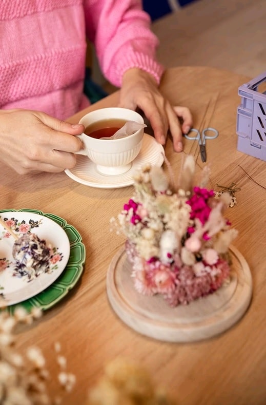 Cinq ans plus tard, l’amoureuse du design déménage sa boutique dans un local plus grand, avec trois pièces communicantes, afin de mettre en place de nouveaux ateliers de deux heures, auxquels on s’inscrit directement sur le site Internet. C’est en observant l’essor des cafés céramique qu’elle a eu l’idée de les associer à un café : « L’atelier fleurs séchées se prête bien au fait de manger un biscuit en même temps ; cela aurait été plus compliqué pour les terrariums », sourit-elle.