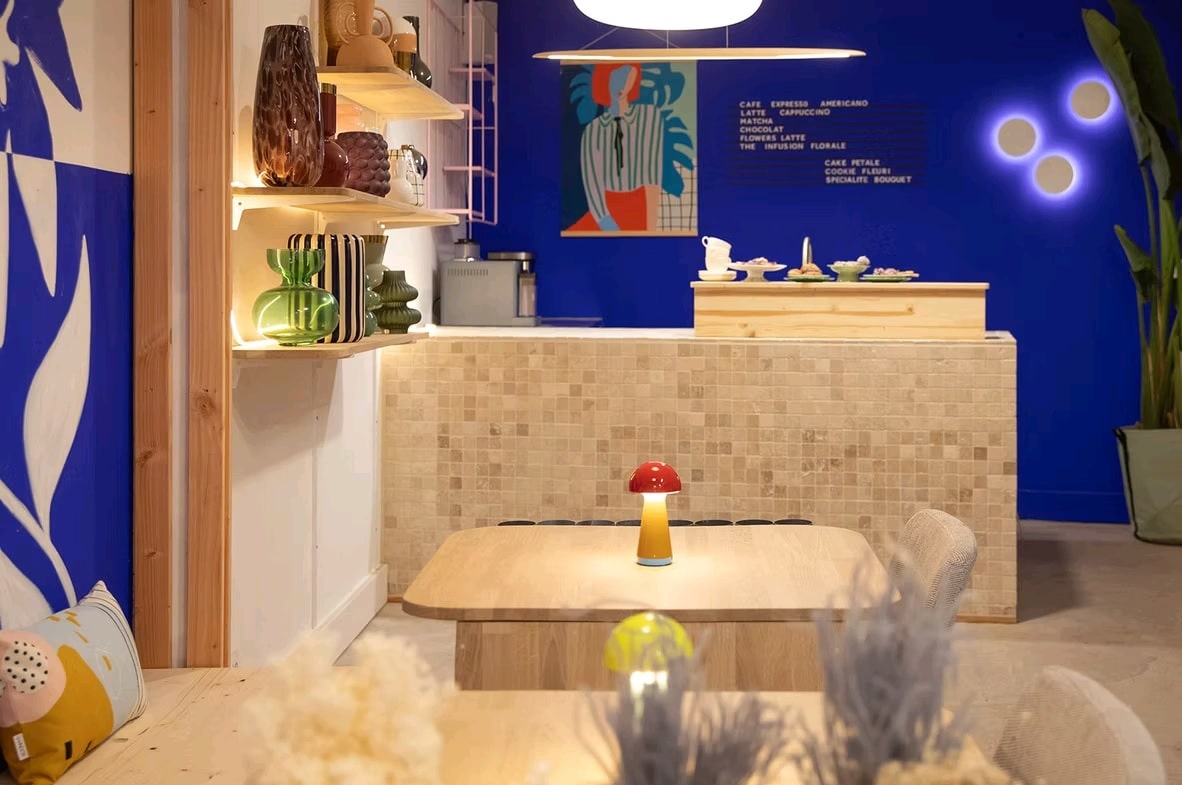 À l’image de sa créatrice accueillante, Mathilde Lelièvre, le café fleurs Saison est un espace lumineux et coloré : une fresque murale habille le lieu de teintes bleues et blanches, des bouquets de fleurs sèchent au plafond, des étagères présentent des compositions florales et des vases colorés, et des formes variées agrémentent la pièce… La carte du café suit, elle aussi, la thématique des ateliers : les pâtisseries faites maison sont décorées de fleurs comestibles et les boissons proposent des thés et tisanes florales.