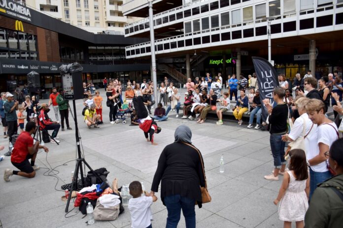 Mardi 23 août, la dalle du Colombier à Rennes s’est animée de nombreux stands et d’activités à destination de toute la famille. Le Centre de chorégraphie national de Rennes et de Bretagne (CCNRB) était de la (block) partie avec la première session de Training Spot. En français, un lieu d’entraînement. C’est ce en quoi consiste le projet itinérant imaginé en 2017 par le danseur et chorégraphe parisien Blondy Mota-Kisoka et la compagnie de hip-hop Street Dance Paris. Après La Chapelle dans le 18e arrondissement de la capitale, Bondy, Saint-Ouen et Montreuil, c’est au tour de Rennes, pour la première fois en province, d’accueillir les pas de danse et les figures acrobatiques des breakers, toutes les après-midi en semaine jusqu’au 2 septembre.