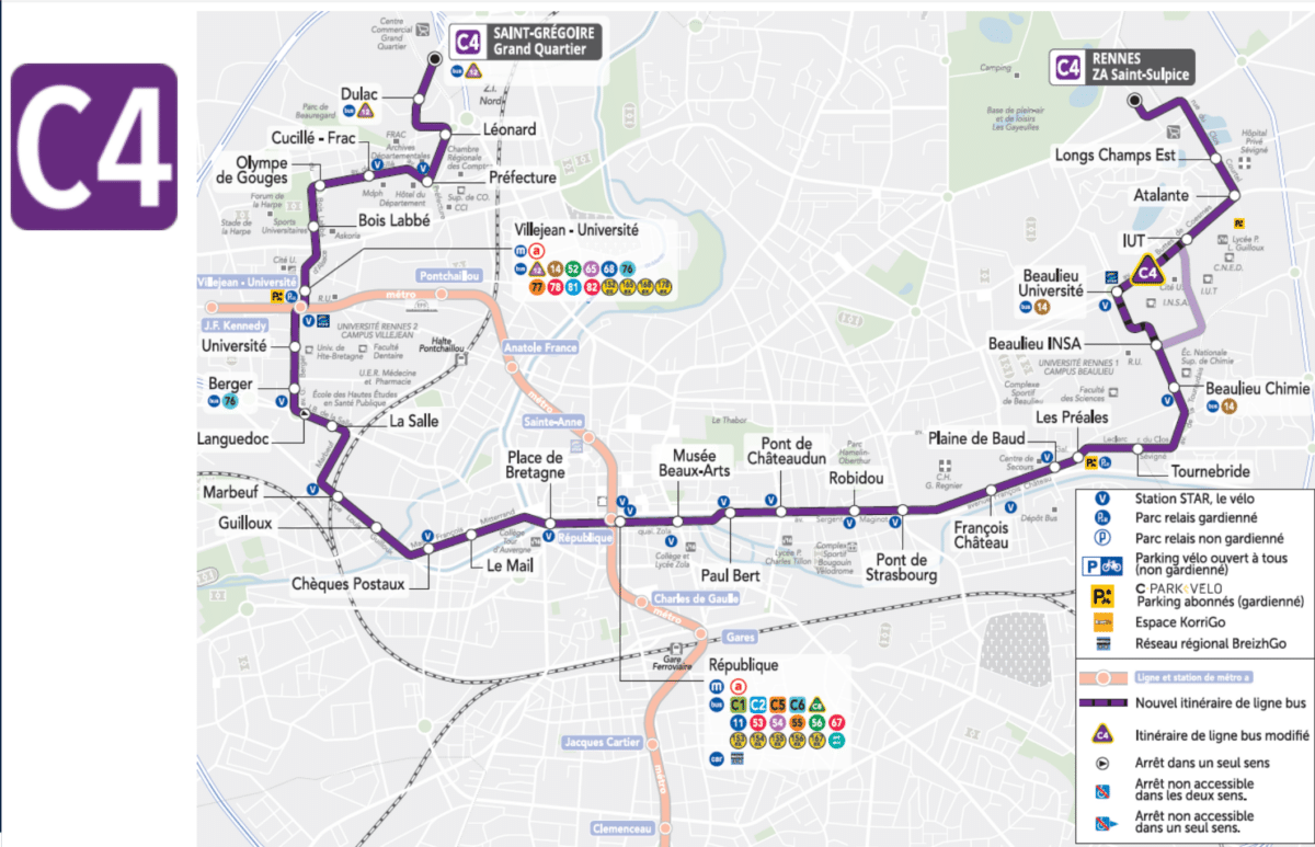 Modification de la ligne C4, dans le campus de Beaulieu : la ligne desservira désormais la station Beaulieu-Université, mais ne desservira plus l’arrêt Becquerel.