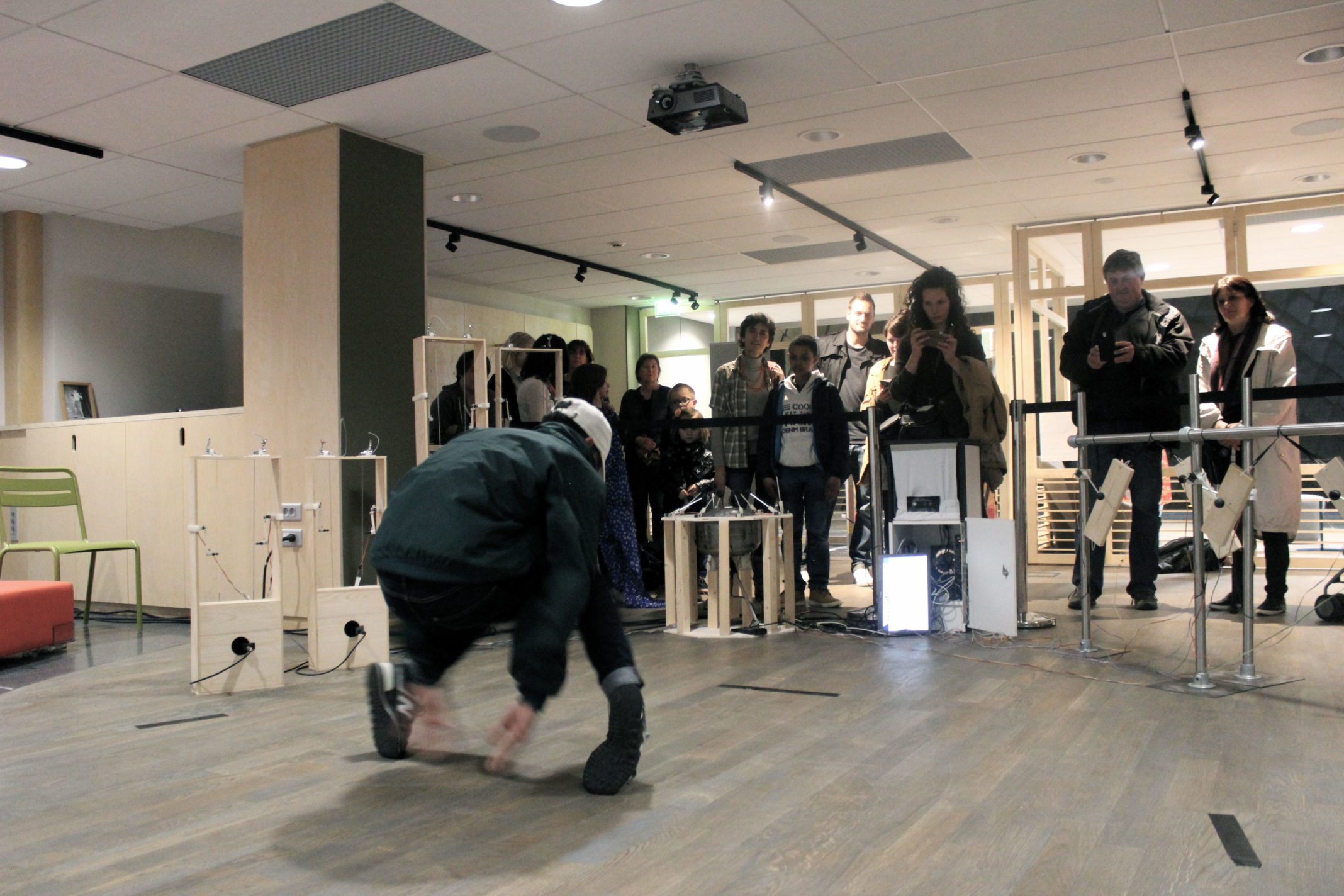 Cette jubilation intergénérationnelle se retrouvait tout au long de l’après midi avec des ateliers et notamment avec l’installation interactive Ork1 d’Alexandre Berthaud. Au milieu d’une petite piste de danse, le danseur active par ses mouvements des instruments à cordes et des percussions conçues par le plasticien musicien. Un manière amusante de résoudre la question “qui précède quoi?”. La musique précède-t-elle la danse ou est-ce le contraire ? La danse peut-elle se faire sans musique et la musique existe-elle sans danse ?