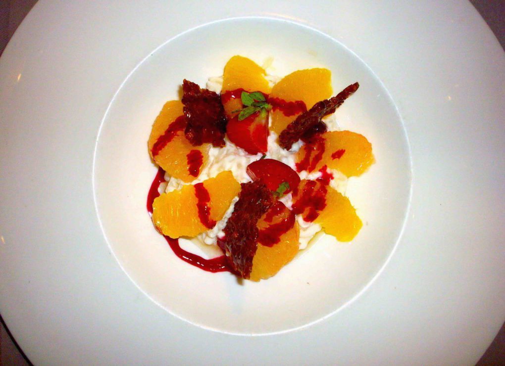 Prenez la chair d’un crabe entièrement décortiqué mélangée avec une bisque de homard, une pointe de mayonnaise et une touche du fameux piment d’Espelette et vous obtiendrez le cœur du croustillant. Ajoutez à cela du chou rave, assaisonné de la même manière et faites-en, au moyen de pâte à filo (proche de la brick), une sorte de cannelloni qui sera ensuite découpé en morceaux. Il aura été préalablement cuit à la plancha en prenant soin de lui donner une section carrée, de sorte que chaque face soit agréablement craquante. Vous commencez à voir ? Disposez cette préparation sur un carpaccio de pommes fruits et de chou rave, les deux finement passés à la mandoline et confits dans un beurre de baratte demi-sel et du jus de pommes.