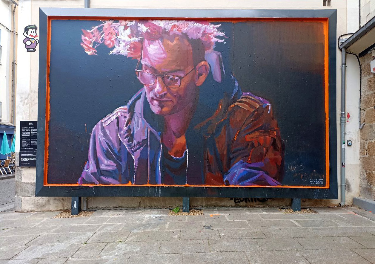 Si un petit « WOW » traverse le bout de vos lèvres en longeant la rue Vasselot, au niveau du numéro 34 précisément, c’est que vous venez de tomber sur la nouvelle beauté du MUR de Rennes. Un jeune homme auréolé d’une couronne de fleurs, le regard vers le bas, y habite depuis quelques semaines. C’est une artiste talentueuse venue de Bordeaux qui nous offre cette nouvelle œuvre picturale, Rouge Hartley.