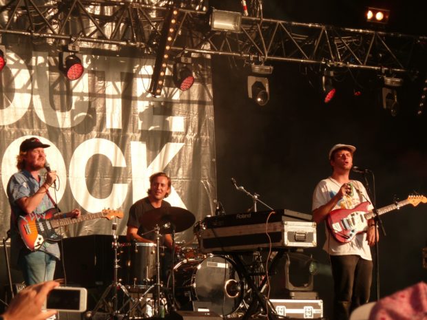 Ensuite, le public, composé en majorité de 20-40 ans, se presse devant le check-point de vérification des bracelets, avant de s’avancer vers la scène « du Fort ». Kurt Vile s’y produit à 20h50 avec « the Violators » ; The War on Drugs, groupe dont Kurt faisait partie à ses débuts, est passé juste avant… petit pincement au cœur pour ceux qui les ont loupés ! Mais les longues ballades du Philadelphien viendront peut-être tempérer leur chagrin. D’une voix nasale rappelant celles de Bob Dylan et Lou Reed (ses modèles avec Neil Young), le songwriter et guitariste délivre des chansons lyriques, calmes au début, mais de plus en plus fougueuses. Bien que son concert soit un tantinet mou, le public est séduit par la voix singulière de ce grand gaillard à la tignasse longue un peu « outdated ». Une belle surprise !