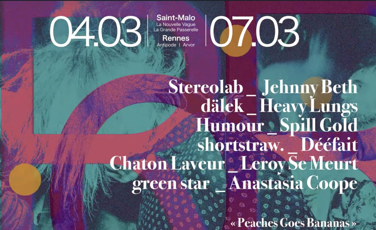 Au programme, le retour rétro-futuriste de Stereolab, l’intensité magnétique de Jehnny Beth, le hip-hop industriel et visionnaire de dälek, le post-punk viscéral de Heavy Lungs, les dissonances acérées de Humour, les incantations psyché de Spill Gold, l’énergie rap-punk de shortstraw., la noise fracturée de Dééfait, la tendresse lo-fi de Chaton Laveur, la colère salvatrice de Leroy Se Meurt, le shoegaze cosmique de green star et l’indie-folk ensorcelante d’Anastasia Coope. Et, pour ouvrir le bal, un film comme une mise au point : Peaches Goes Bananas de Marie Losier, portrait au long cours d’une icône queer et féministe.