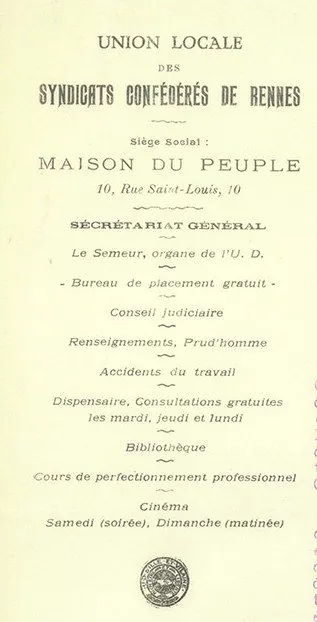 En 1891, les syndicats rennais réclament un lieu de rencontre appelé bourse du travail. C’est un mouvement national, une démarche désormais établie dans le monde ouvrier, la première bourse du travail ayant vu le jour à Paris en 1887. Une lettre rédigée par les syndicalistes est envoyée au maire et aux conseillers municipaux. Leur revendication : un lieu public pour débattre de leurs intérêts professionnels et où les ouvriers sans travail pourraient se voir proposer des emplois. Le maire de l’époque Jean Janvier se déclare défavorable à cette initiative. Après une seconde requête, appuyée cette fois par des conseillers municipaux de Rennes, une pétition est signée en 1892. En avril 1893 naît la Bourse du travail de Rennes. On peut y trouver un bureau de placement, un lieu de rencontre pour les syndicalistes, mais aussi un lieu d’éducation et de formation.