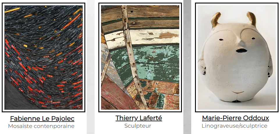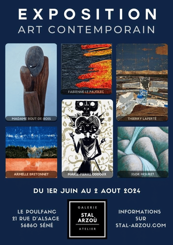 La nouvelle exposition de Stal Arzoù accueille depuis ce début juin 2024 : le peintre et sculpteur Thierry Laferté ; la sculptrice et linograveuse Marie Pierre Oddoux ; la photographe Armelle Bretonnet ; le peintre Igor Mourret ; la sculptrice Delphine Tréhard et bien-sûr la mosaïste Fabienne Le Pajolec, propriétaire de la galerie