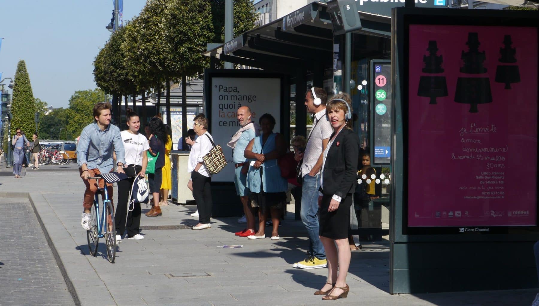 Le temps du festival des Tombées de la Nuit, la capitale bretonne accueille la première partie de ce triptyque, « Foule sentimentale ». Quand il s’agit de lieux d’attente partagés à Rennes, quel meilleur endroit que la Place de la République ? Point stratégique dans le centre-ville, le trafic y est dense et continu (sans non plus le comparer au flux de la capitale parisienne…). Toutes les générations se confondent, offrant un florilège potentiel de spectateurs et de réactions hétéroclites.