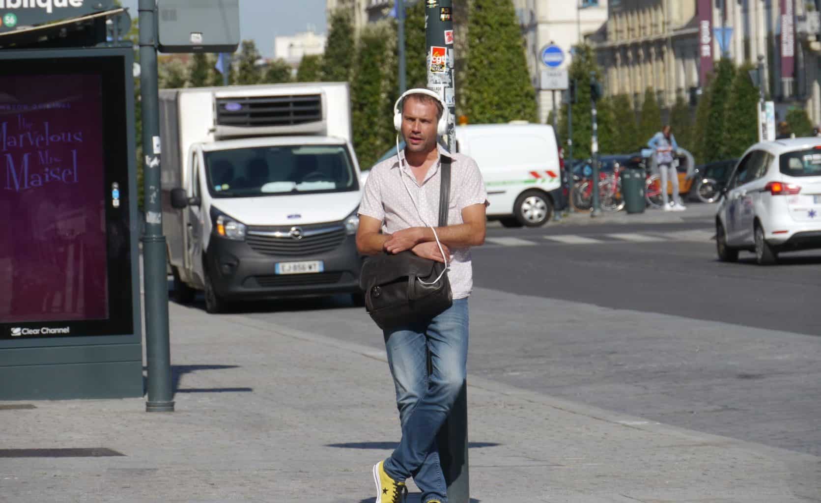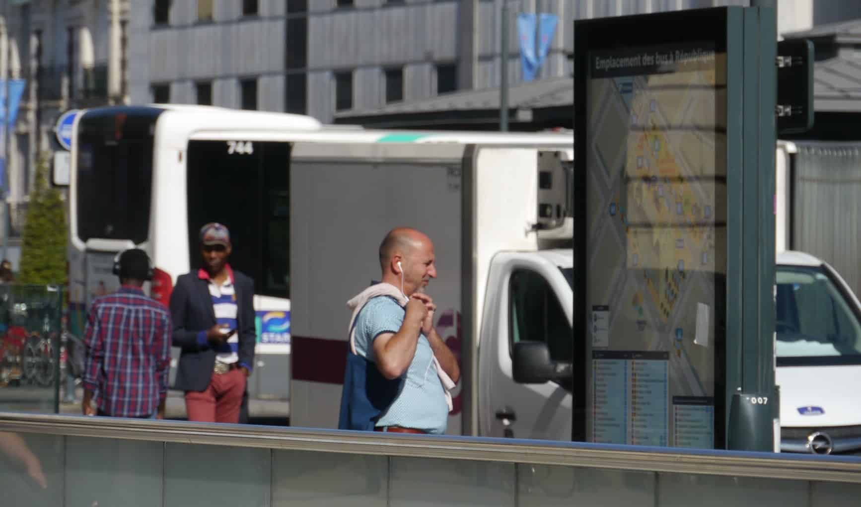 Une fois la ville bien éveillée, aux alentours de 10 h, la performance commence au milieu de l’effervescence de la place de la République. Entre deux arrêts de bus, une voix masculine s’élève doucement. Casque blanc sur les oreilles, un homme fredonne un tube de 2005 (« Ma philosophie », Amel Bent) avant d’être accompagné par une voix féminine. Une troisième se fait entendre un peu plus loin… Dans ce jeu théâtral non-convoqué, une chorale s’improvise.