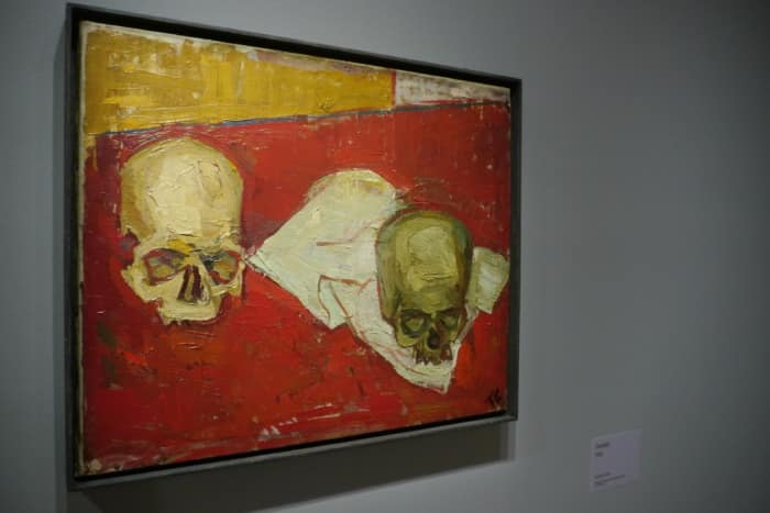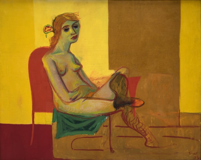 L’ouverture colorée laisse présager une explosion de couleurs. Le Nu aux bas rouges (1934) à la facture expressionniste accueille le spectateur dans des teintes vertes, rouges et jaunes. Qui était Tal Coat ? Peintre encore trop méconnu en Bretagne et ailleurs, né à Clohars-Carnoët (Finistère), près de Pont-Aven, Tal Coat (« Front de bois » en breton) était semble-t-il un caméléon qui n’a eu de cesse d’interroger l’art. Des décennies de recherches plastiques qui l’ont conduit à considérer la peinture comme une expérience sensible.