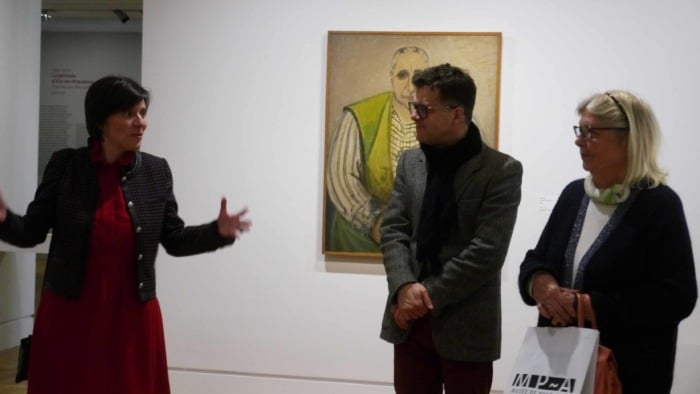 Jeudi 31 janvier 2019, en présence de la fille de l’artiste, la directrice et conservatrice du Musée de Pont-Aven, Estelle Guille des Buttes-Fresneau et le directeur artistique du domaine départemental de Kerguéhennec et commissaire d’exposition Olivier Delavallade ont inauguré Tal Coat (1905-1985) – En devenir. On aperçoit derrière eux le Portrait de Gertrude Stein de Pierre Tal-Coat, 1935.