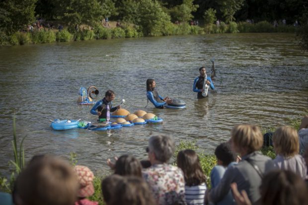 Rennes est l’une des ville-pionnière de la culture alternative depuis plus de 30 ans. Pas étonnant alors que cette édition des Tombées de la Nuit 2014 compte une programmation musicale. Qui plus est, Apigné sait jouer avec son environnement. Si les spectacles musicaux sont foison à Rennes, les concerts aquatiques sont eux un peu moins courants. Les Tombées de la Nuit ont réussi le grand plongeon ! Trois plongeurs, habillés d’une combinaison saillante bleue et noire, proposent leur Concert’Eau en Do Nageur, un spectacle aquatique innovant et humoristique. Des pommeaux de douche et tubas recyclés en flûtes, des arrosoirs arrangés en sax-eau-phones, des instruments plus loufoques et ingénieux les uns que les autres, chantant en harmonie au contact de l’eau. Même l’élément liquide se mue en un instrument de percussion. Didgerid’eau, percussions et instruments se mêlent à merveille sur des rythmes funk, jazz ou cumbia. Le public en redemande et certains n’hésitent pas à venir rejoindre le trio dans l’eau pas très claire de l’étang… Le trio toulousain a charmé son public au terme d’un spectacle éblouissant et éclaboussant.