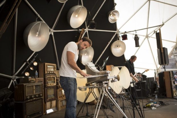 Le ciel s’obscurcit et l’ambiance se réchauffe. Après avoir mangé une pizza et chanté au Quignon sur Rue, la foule se rassemble sous le dôme. Les spectateurs ont pu assister au spectacle étonnant qu’ont proposé Loup Barrow & Olivier Mellano. Ce dernier à la guitare et le premier aux mains d’un instrument plutôt particulier. Moitié xylophone métallique, moitié piano, cet instrument à lames en duo donne un son très expérimental, très particulier et que l’on ne retrouve nulle part ailleurs. Une prestation qui a scotché le public des Tombées de la Nuit, face à cette musique déconcertante et très contemporaine.
