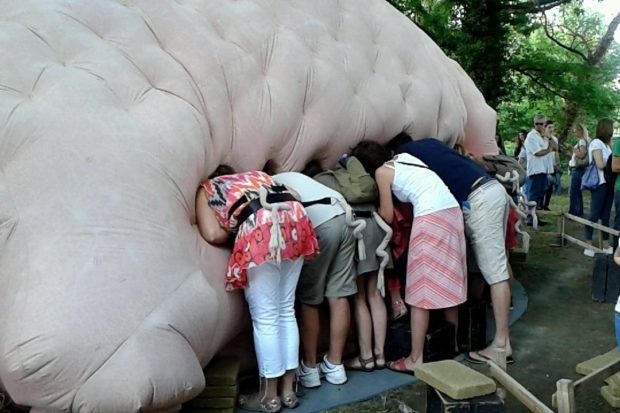 Les rencontres insolites se poursuivent le long de l’étang d’Apigné et de sa base nautique. Et si le centre-ville de Rennes a eu droit à l’étonnante RedBall, boule rouge de cinq mètres de diamètre, Apigné a lui eu droit à sa truie gonflable de neuf mètres de long. Venue tout droit d’Angleterre, celle qu’on appelle Pig propose aux spectateurs, affublés d’une queue en tire-bouchon pour l’occasion, de venir jeter un œil à l’intérieur grâce à sa dizaine de mamelles amovibles cachant un spectacle de théâtre d’objets musical et sans paroles. Sans conteste l’un des succès de cette édition, notamment auprès des enfants étonnés par cet humour british décapant, sauce Monty Python.