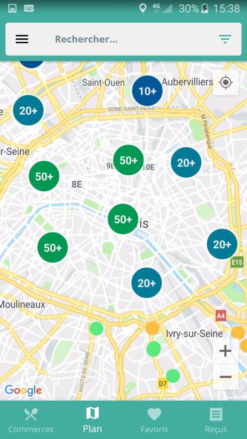 N’ayant donc pas vraiment compris comment fonctionnait la barre de recherches, nous avons agrandit la carte pour voir comment se présentait les choses dans une grande ville comme Paris. Les commerces sont si nombreux qu’un chiffre en indique le nombre, puis on peut choisir son arrondissement et trouver ainsi un commerce qui nous convient : au vu du nombre de partenaires, le filtre pour semble ici plus pertinent si l’on cherche des produits vegan par exemple.