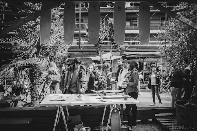 Situé de l’autre côté du pont Riquet, à cheval entre la Chapelle, la Goutte d’Or et Stalingrad, entre les voies ferrées qui mènent aux gares du Nord et de l’Est, Marx Dormoy fait partie de ces quartiers mutants du Nord parisien. Après le Cent-quatre, est arrivé le réaménagement du marché de l’Olive, puis de la Halle Pajol. Pajol est le premier écoquartier parisien du genre, situé dans le 18e arrondissement de Paris. Construite en 1926, le long des voies de la gare du Nord, elle était anciennement « La Messagerie des Douanes ». Une opération de réhabilitation d’envergure a été mise en place pour en faire le quartier que l’on peut découvrir aujourd’hui. Jardins le long des voies, auberge de jeunesse, bar-restaurant, boulangerie à l’américaine, bibliothèque, ateliers, terrasses à n’en plus finir… Cet espace de 10 000 m2 à l’architecture innovante, mi-bois mi-béton, accueillera le temps d’un week-end des artistes de tous horizons.