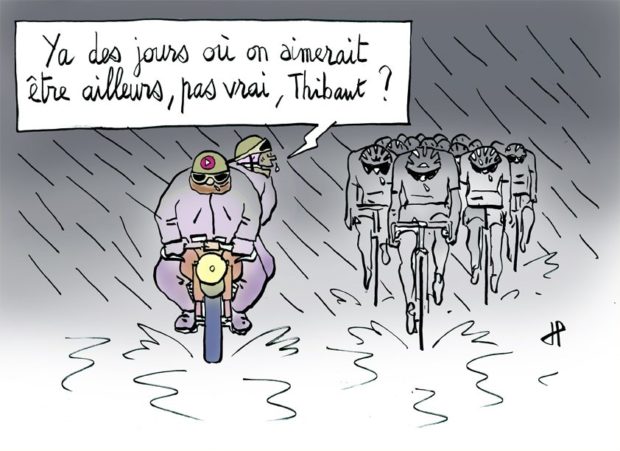 Vent, pluie, arrivée au milieu de nulle part, sur l’eau… La deuxième étape du Tour de France a tenu toutes ses promesses. La moitié des favoris se sont faits piéger dans les bordures et dans les chutes nombreuses mais heureusement sans gravité. Nibali et Pinot sont arrivés avec près de 1,30 mn de retard… Froome et Contador étaient, eux, dans le bon wagon. Le Tour est lancé et Madame Georges, notre reporter, traque l’info, jusque dans les placards des chambres !