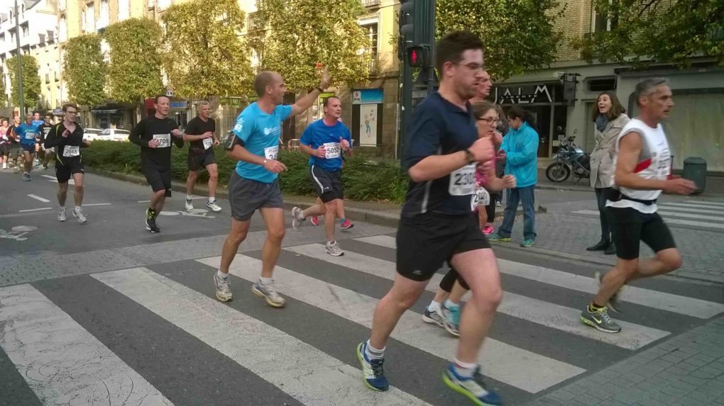 Mais nous étions environ 4000 et à ce stade, cela commence franchement à devenir un phénomène de société. Qui sont-ils, ces gens que l’on voit courir le soir ou le matin, dans les parcs ou le long des promenades, un casque sur les oreilles ou sanglés simplement dans un short moulant ? Et surtout, après quoi courent-ils ? Si l’on peut regretter l’ambiance musicale qui baignait le départ de la course, on pouvait en revanche se réjouir de la bonne humeur et du partage qui semblaient réunir ces gens. Il y a de tout, dans cette foule : des professionnels comme des amateurs, des licenciés de club qui portent leur couleur, des qui courent ensemble, des qui court en solitaire, des très jeunes, des parfois très vieux. Le départ voit progressivement la foule se disséminer dans les rues de Rennes. Derrière les barrières, des gens nous acclament. Par les fenêtres, on voit parfois une tête endormie ou étourdie par la veille nous regarder passer avec un air incrédule, un regard à la fois de respect et de pitié.