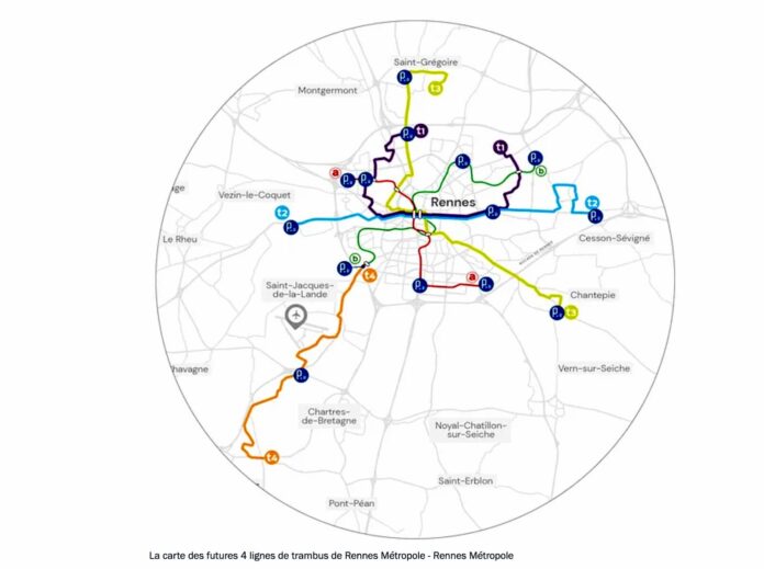 Le projet rennais prévoit l’installation de quatre lignes de Trambus (T1 à T4). La première mise en service sera la ligne T2, prévue en 2027, entre la route de Lorient à Rennes et le secteur de la Rigourdière à Cesson-Sévigné. Les lignes T1, T3 et T4 suivront d’ici 2030, cette dernière reliant notamment Saint-Jacques-de-la-Lande à Bruz et desservant plusieurs zones périphériques de la métropole. Ce système est en phase avec la volonté de la métropole de renforcer son réseau de transport en commun tout en réduisant son empreinte carbone.
