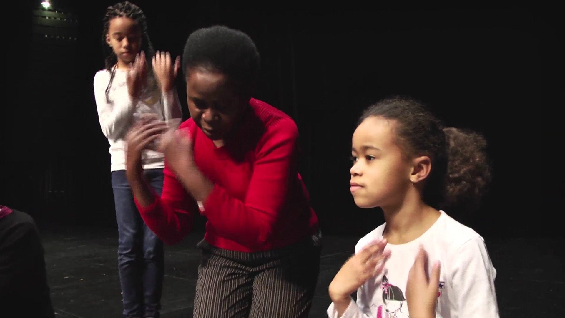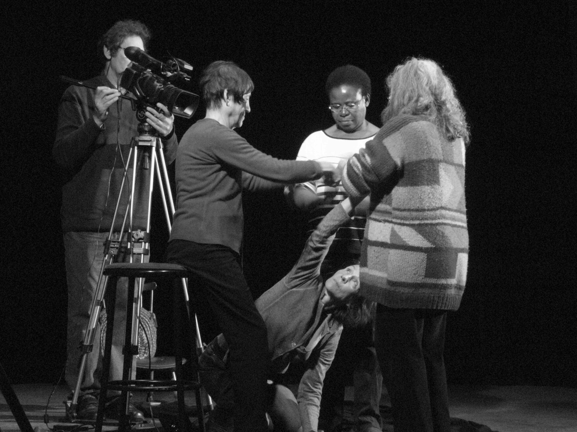 La proposition de travailler sur les gestes est venue de Pascale Houbin. Après Marie-Léonie qui exécute (à blanc) le geste du lavage de linge (tordre et essorer revêt un sens particulier dans ce pays où les femmes violées sont légions !), nous avons introduit Theda Mara, Brésilienne qui prépare le manioc comme si elle dansait. Et enfin Maya Mémin qui « lave le riz comme elle mélange les encres ».