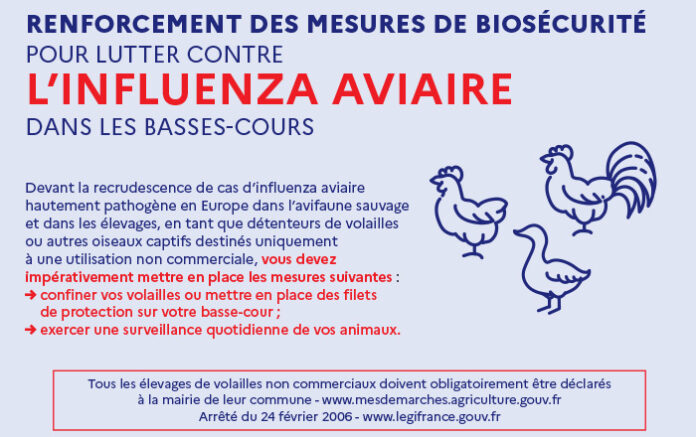 Il est aussi rappelé aux détenteurs de basse-cour leur obligation de se déclarer auprès de leur mairie, de claustrer leurs volailles (ou de couvrir le parcours d’un filet) et de signaler à un vétérinaire toute mortalité ou événement sanitaire anormal.