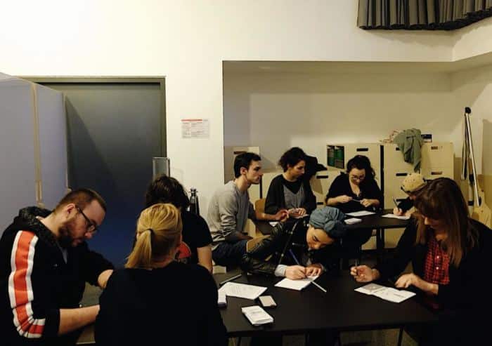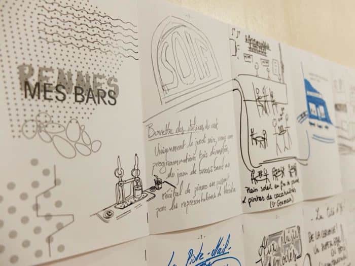 Sarah Bouchir : L’objectif est de traduire l’âme de la ville et son atmosphère autant par les textes que par les illustrations. Nous avons commencé par faire une cartographie textuelle sur une grande feuille, avec Rennes écrit en son milieu. Chaque personne de l’association s’est demandé ce qu’était Rennes pour lui. Nous avons identifié deux univers bien distincts. D’un côté, le bouillonnement de projets de créateurs qui se développent à ciel ouvert ; de l’autre, le bouillonnement alternatif avec des activités plus underground. Nous avons tiré des notions de toutes ces visions de Rennes et avons construit des éléments graphiques à partir de ces idées.
