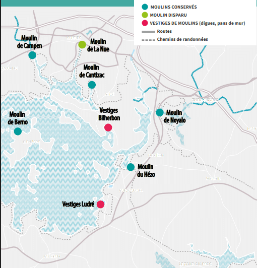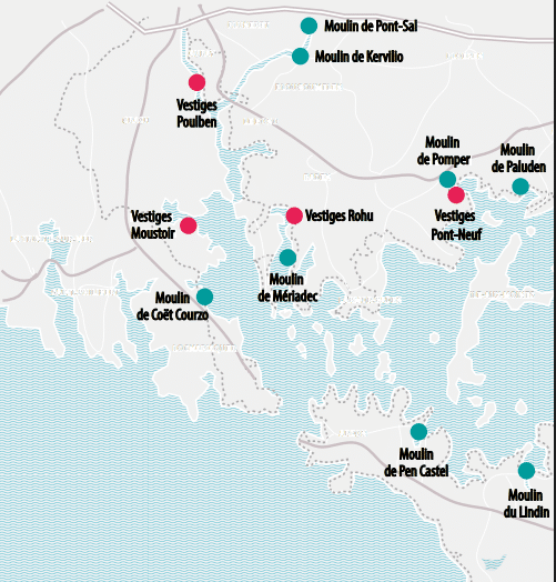 C’est en Bretagne que se concentrent les deux tiers des moulins à marée du littoral français ; le phénomène est lié à l’ampleur de ses marées et à sa géographie très découpée. Petite mer intérieure, le Golfe du Morbihan en compte encore une douzaine.