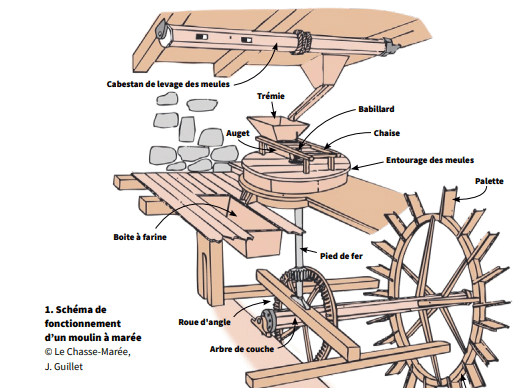 Témoins du passé, les moulins à marée étaient construits au niveau de l’estran, dans de petites anses où la marée montante se trouvait retenue par une digue. Ils utilisaient la force de la marée descendante pour actionner un mécanisme composé d’une roue et d’une meule, pour moudre des grains et produire de la farine. Ces moulins à marée étaient accessibles autant de la terre que de la mer, car des petites embarcations venaient accoster pour décharger du grain et embarquer des sacs de farine.
