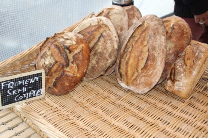 Les pains et viennoiseries sont 100% levain bio et cuits au four à bois, fabriquées à partir des farines produites sur la ferme et issues des céréales cultivées sur l’exploitation.