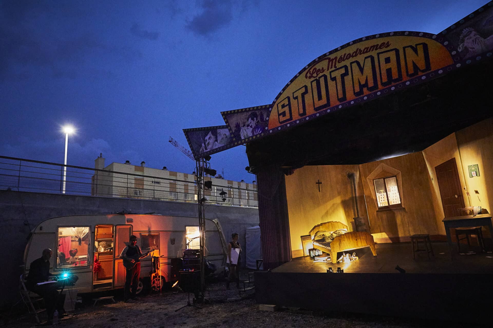 Ce choix d’investir des espaces extérieurs était cher à la troupe, principalement axée sur le théâtre de rue*. Leur précédente production, À bien y réfléchir, et puisque vous soulevez la question, il faudra quand même trouver un titre un peu plus percutant, s’étant jouée en salle, la troupe a souhaité poursuivre une réflexion qu’elle affectionne sur l’opposition entre théâtre en salle et théâtre de rue. Philippe Nicolle ajoute : « Nous avions aussi l’envie de nous confronter aux difficultés de cette forme théâtrale et de nous rapprocher des origines du théâtre mélodramatique concentré sur la magie scénique. On avait aussi envie de bronzer ! »